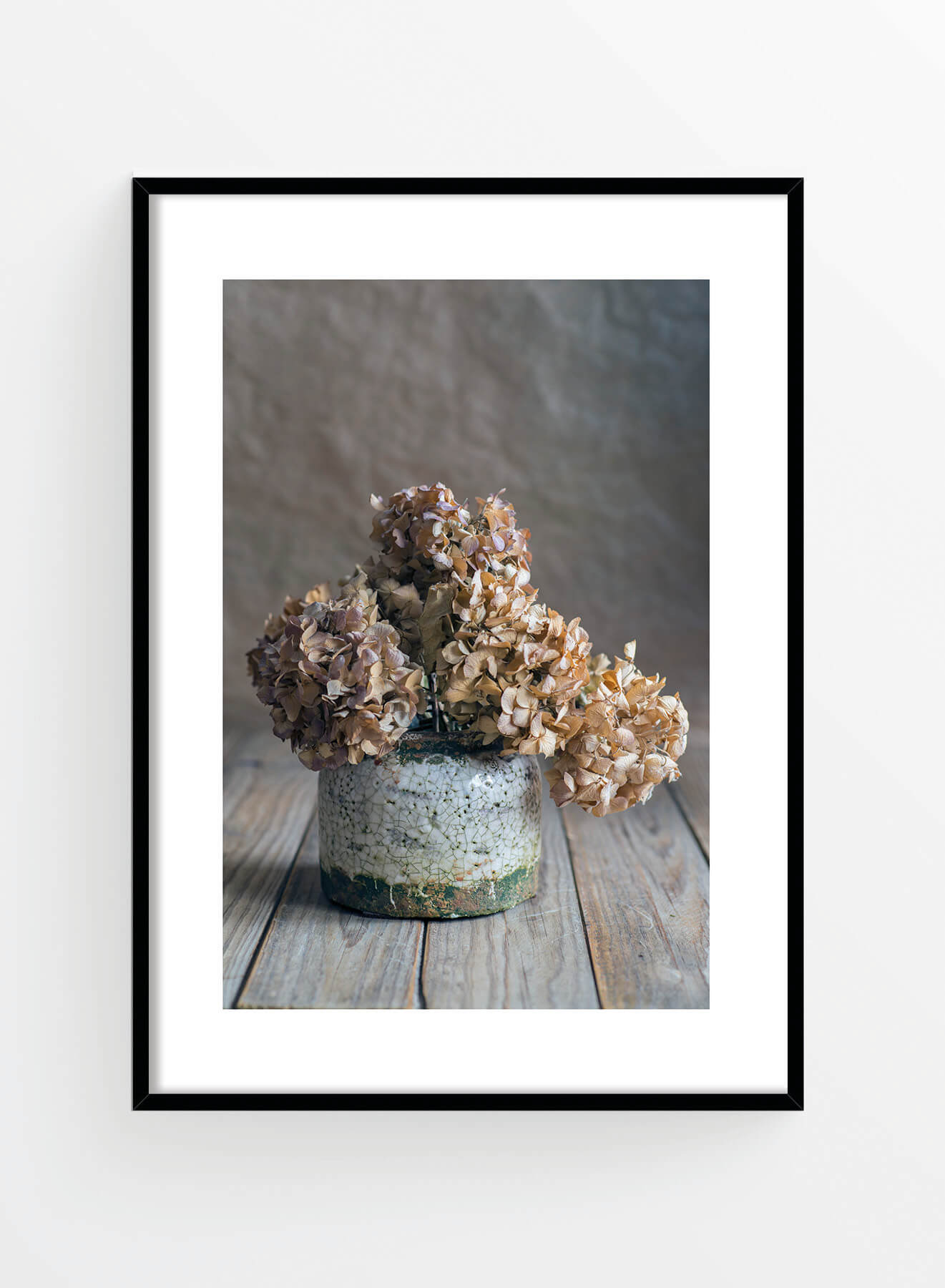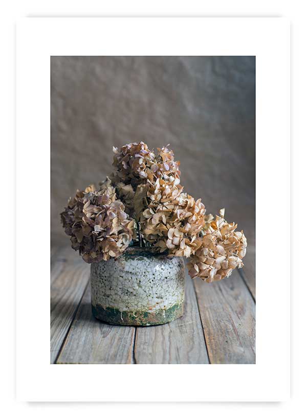 Poster cu tematică botanică care se potrivește perfect într-un dormitor romantic. Florile roz pal pe fundalul în tonuri de gri creează o senzație de liniște și fragilitate. Include marginea albă care imită un passepartout.