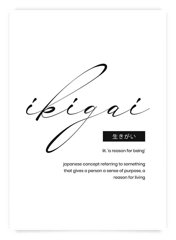 Poster tipografic cu definiția conceptului japonez 'Ikigai' în limba engleză 'lit. 'a reason for being' japanese concept referring to something that gives a person a sense of purpose, a reason for living'. Îl poți afișa în holul locuinței alături de alte postere monocromatice. De asemenea, îl poți asorta cu orice ramă și îl poți oferi cadou celor dragi.