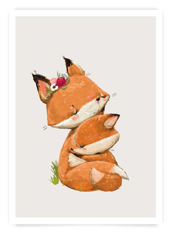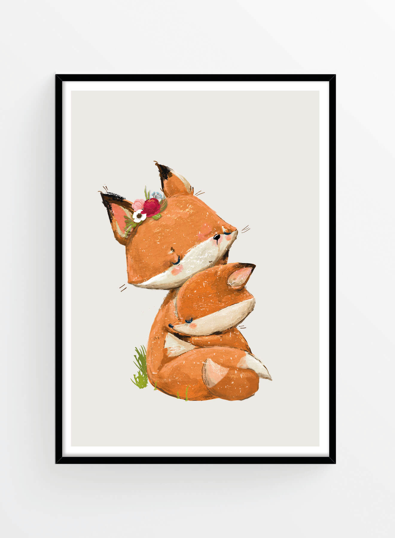 Ilustrație specială pentru decorarea camerei copiilor cu mama și puiul de vulpe îmbrățițându-se. Design-ul include o margine albă subtilă.