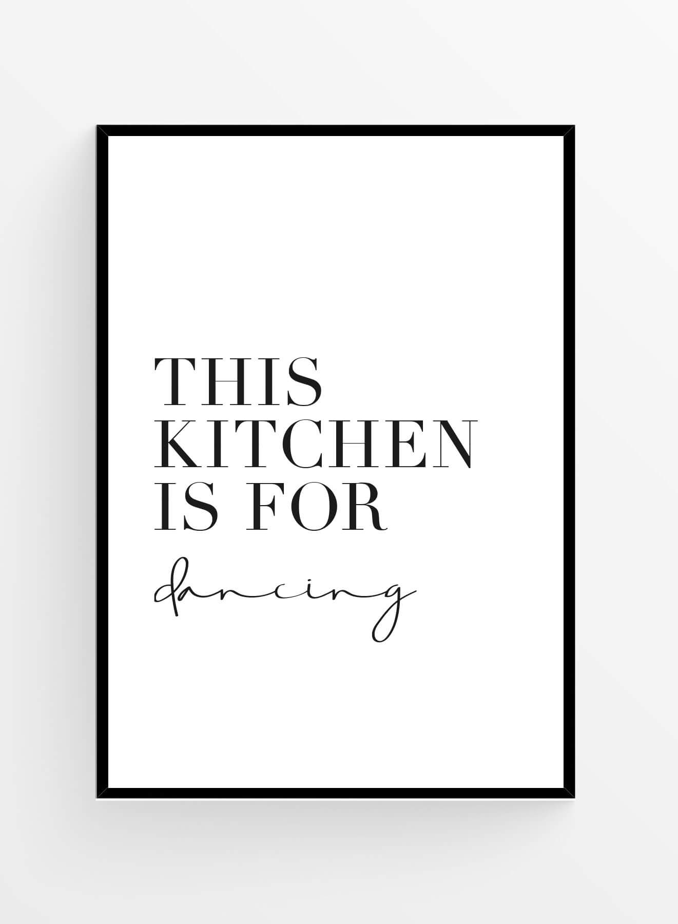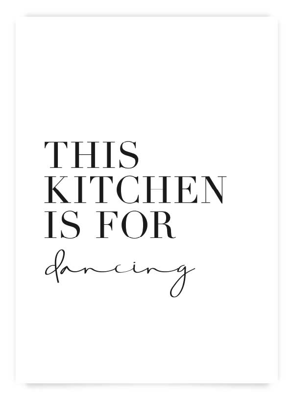 Poster inspirațional cu text 'This kitchen is for dancing' pe fundal alb.