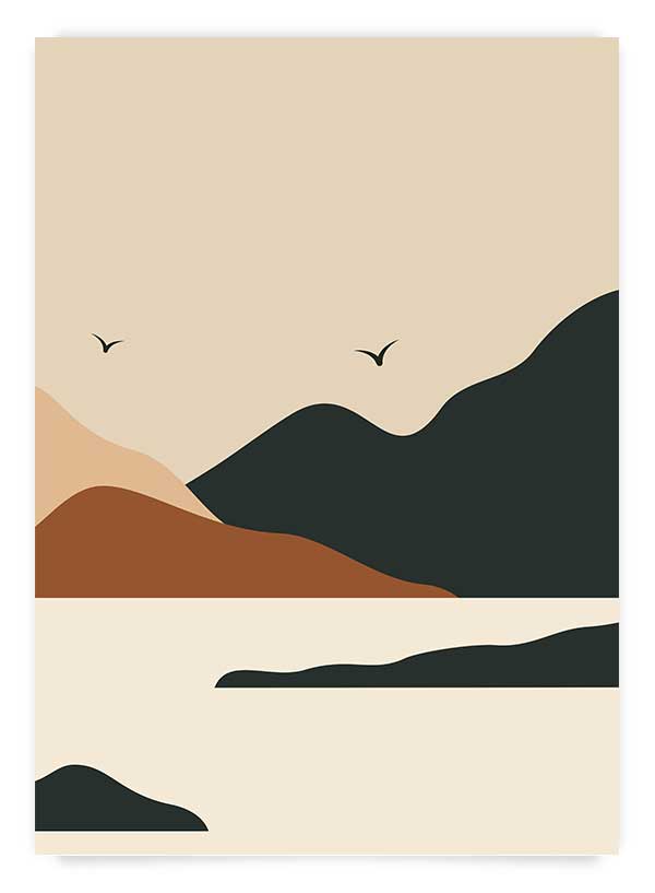 Poster minimalist cu peisaj în nuanțe de bej, maro și bleumarin și păsări. Comandă-l împreună cu modelele 'Landscape 6' și 'Landscape 8' și vei avea un set de 3 postere scandinave.