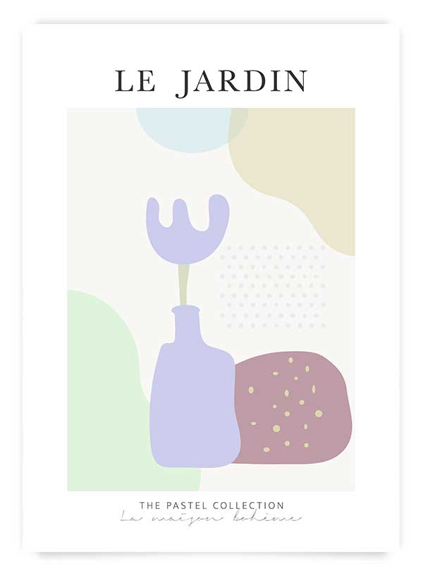 Un poster modern cu ilustrații în nuanțe pastel și text 'Le jardin' (în partea de sus), respectiv 'The Pastel Collection - Le maison boheme' în partea de jos. Poate fi comandat împreună cu modelul 'Le jardin 2' și 'Pastel abstract' pentru un set de 3 postere. Adaugă o ramă albă, neagră sau de lemn.