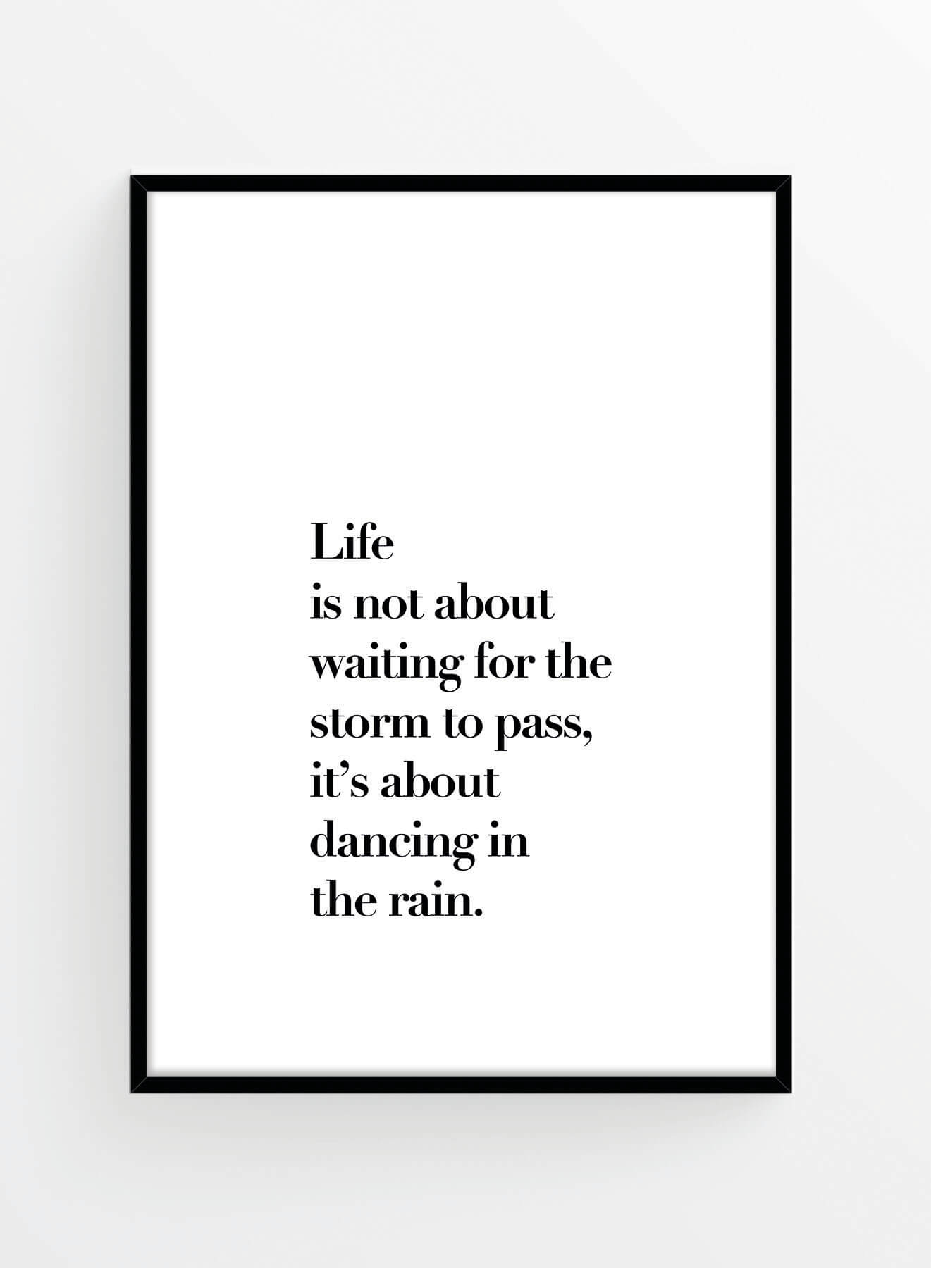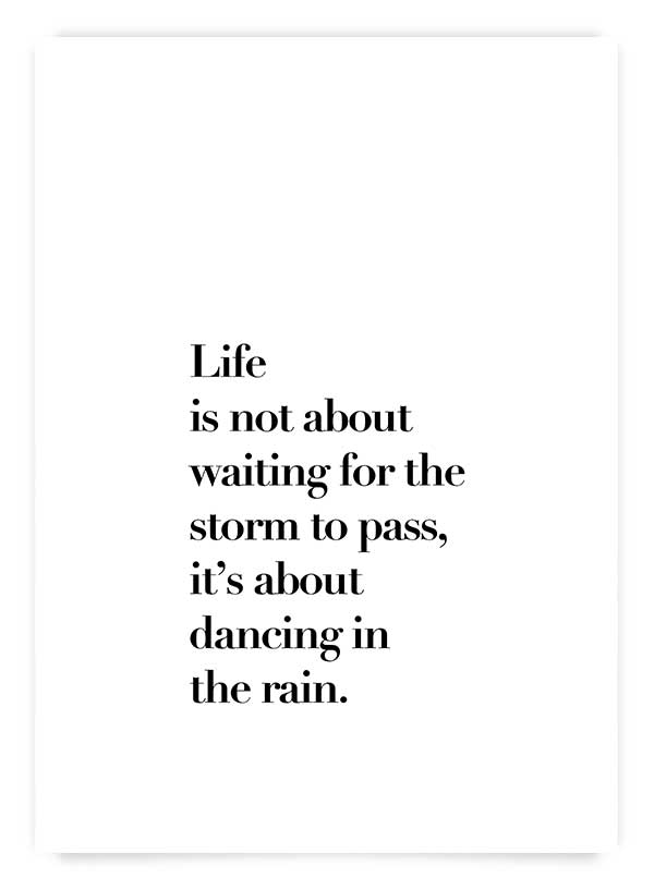 Poster cu motivațional 'Life is not about waiting for the storm to pass, it's about dancing in the rain.' Perfect pentru a fi așezat într-un loc care te va face să-l citești în fiecare zi, sau a fi dăruit cadou unui prieten drag. Adaugă o ramă neagră, albă sau de lemn și amintește-ți să te bucuri de fiecare clipă!