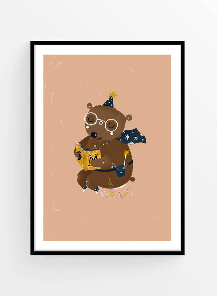 Un poster pentru camera copiilor cu ilustrație ursuleț care citește pe fundal pastelat.