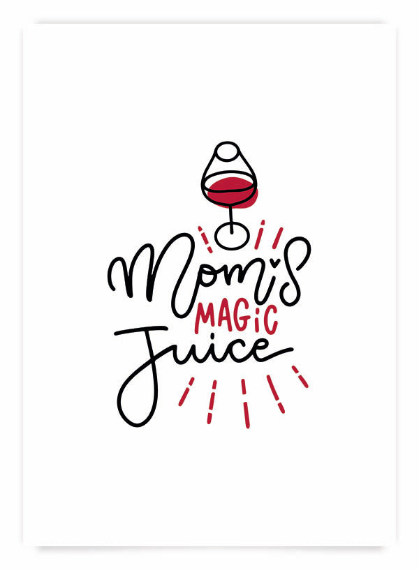 Poster pentru bucătărie cu text 'Mom's magic juice' și ilustrație line-art.