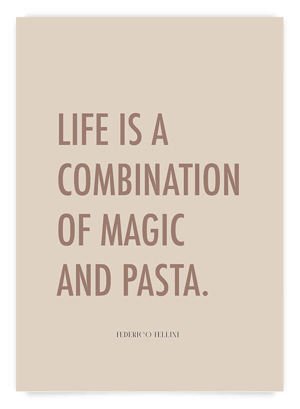 Inspiră-te în fiecare zi din posterul în nuanțe de bej care prezintă citatul memorabil al marelui regizor Federico Fellini "Viața este o combinație de magie și paste"/ 'Life is a combination of magic and pasta'. Un art print perfect pentru pasionații de artă și de savoarea vieții.