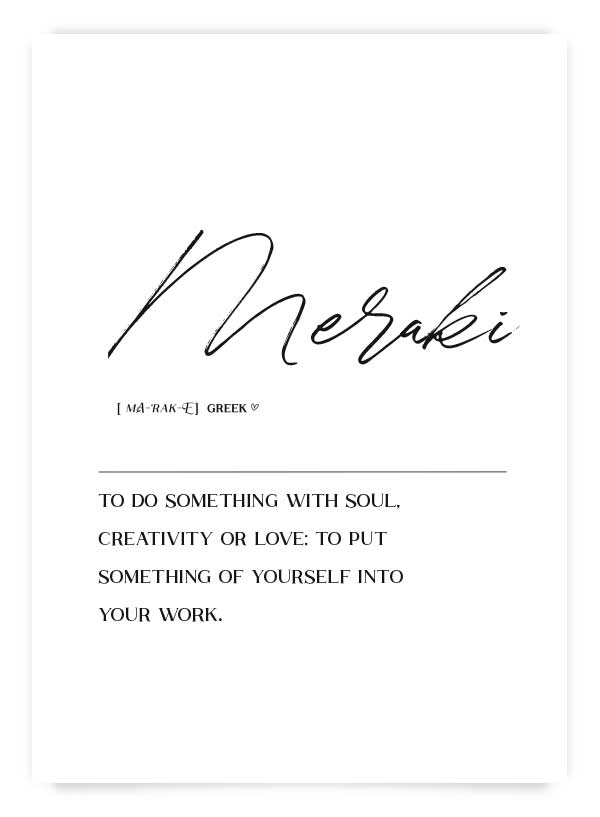Poster alb negru tipografic cu text 'meraki' - conceptul din limba greacă. Nu uita să adaugi o ramă albă, neagră sau de lemn