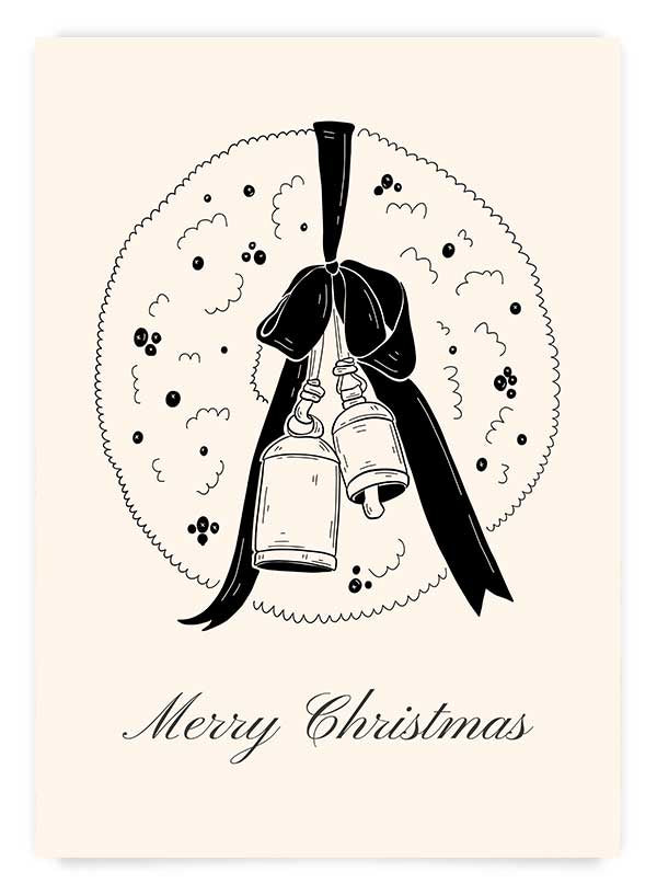 Ilustrație minimalistă modernă clopoței cu fundă, text 'Merry Christmas' și elemente grafice pe fundal beige. Poate fi comandat alături de o ramă albă, neagră sau de lemn pentru decorarea casei de Crăciun.