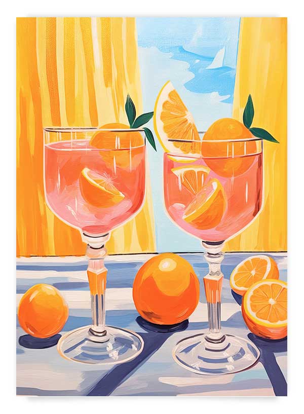 Îmbogățește-ți decorul bucătăriei cu acest poster ce prezintă ilustrații cu două pahare de cocktail Aperol Spritz în culori vibrante. Adaugă o notă artistică în spațiul tău de gătit. Recomandăm rame albe sau de lemn în culori deschise pentru înrămare.