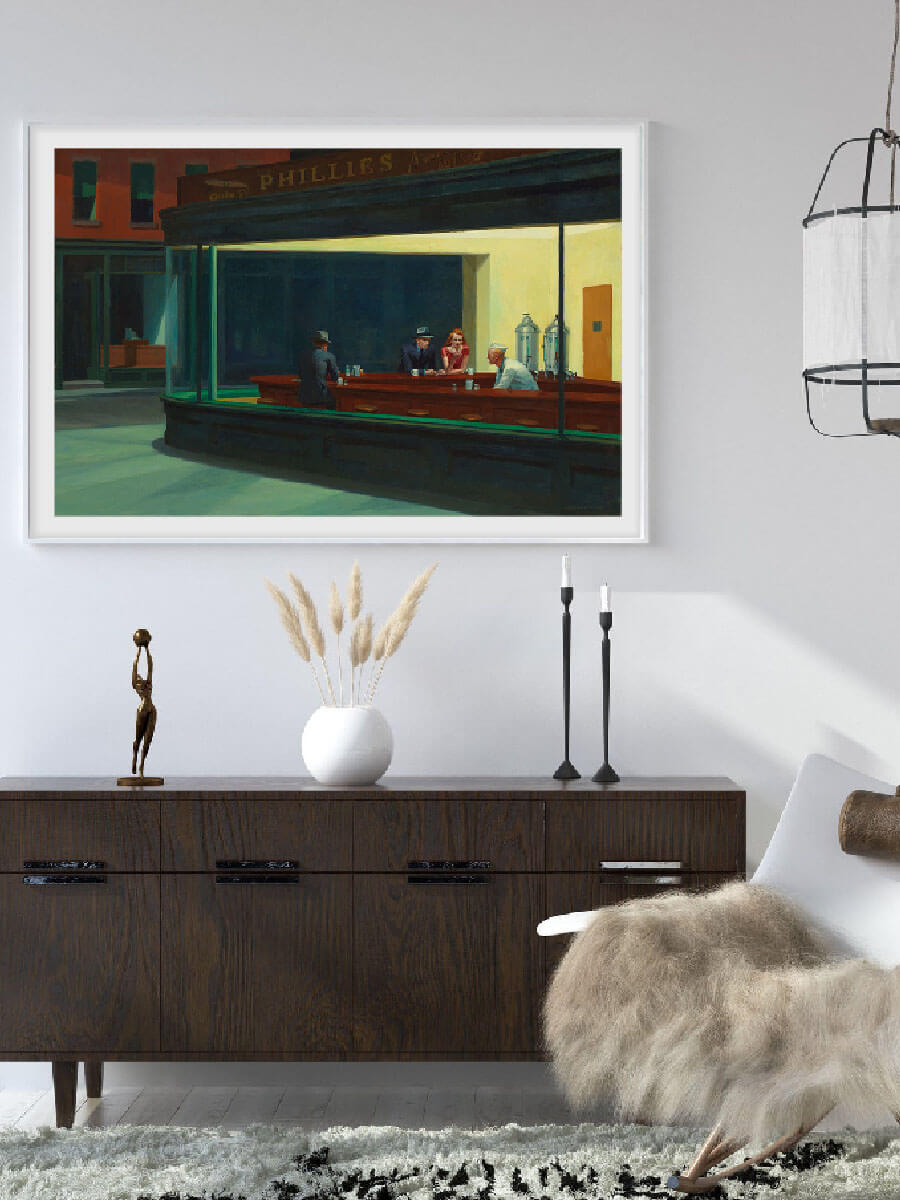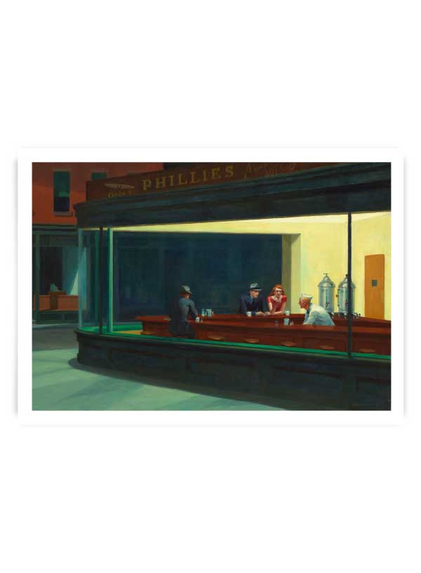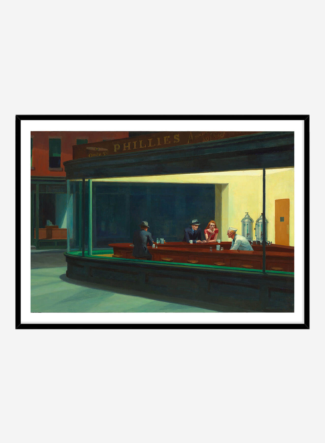La o cină care se desfășoară noaptea, trei clienți stau la tejghea vizavi de un barman, fiecare părând a fi pierdut în gânduri și deconectat unul de celălalt. Prin forme geometrice armonioase și strălucirea luminii electrice a restaurantului, Hopper a creat o scenă senină, frumoasă, dar enigmatică. Deși inspirată de un restaurant pe care Hopper l-a văzut pe Greenwich Avenue din New York, pictura nu este o transcriere realistă a unui loc real. Ca spectatori, suntem lăsați să ne întrebăm despre figuri, relațiile lor și despre pustietatea peisajului urban.