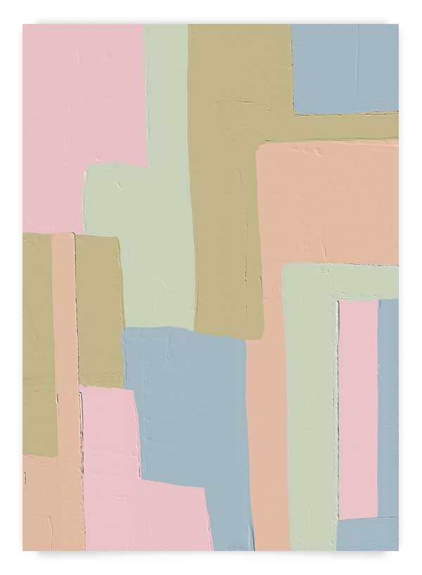 O lucrare abstractă în nuanțe pastel, care îmbină tonuri de roz, verde mentă, albastru pal și bej pentru a crea o compoziție calmă și echilibrată. Ideal pentru interioare moderne sau minimaliste. Potrivit pentru living, dormitor sau birou.