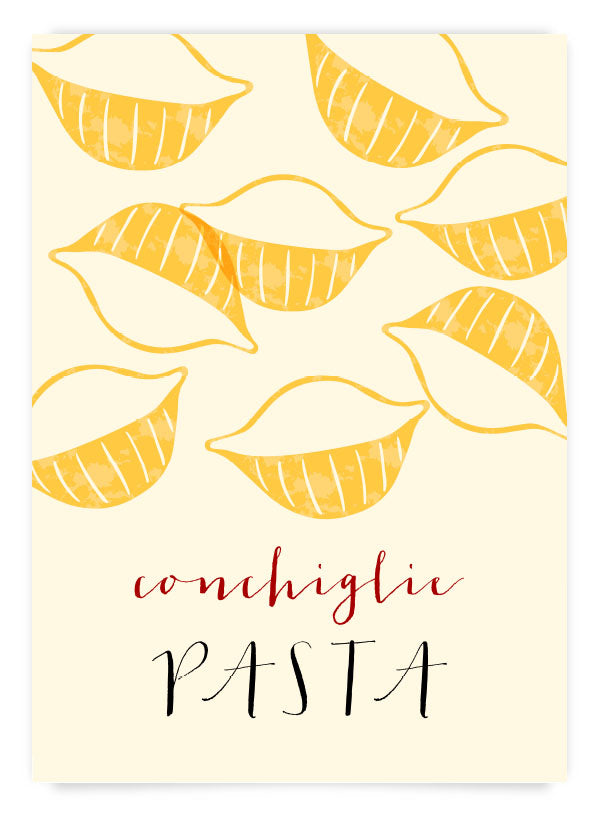 Pastele conchiglie sunt o varietate de paste, denumite astfel datorită formei lor distinctive, care amintește de cochiliile de scoici de mare. Posterul poate fi combinat cu celelalte modele asemănătoare pentru a decora bucătăria unui pasionat de preparatele din Italia.