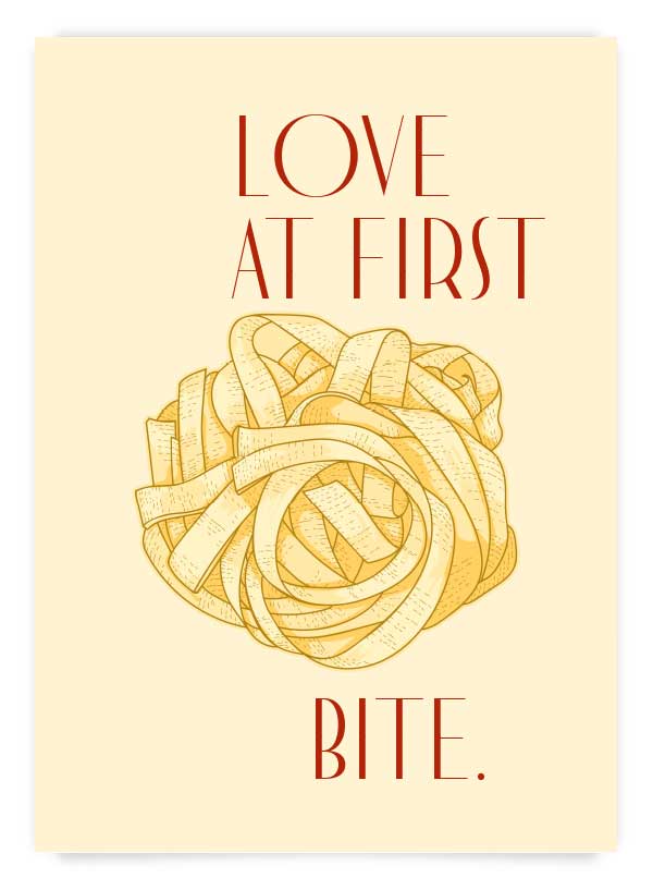 Poster cu ilustrație paste tagliatelle și text 'Love at first bite'.