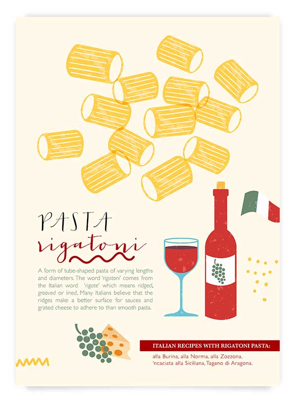 Poster pentru bucătărie cu ilustrații și informații text despre unele dintre cele mai iubite tipuri de paste: pastele rigatoni.