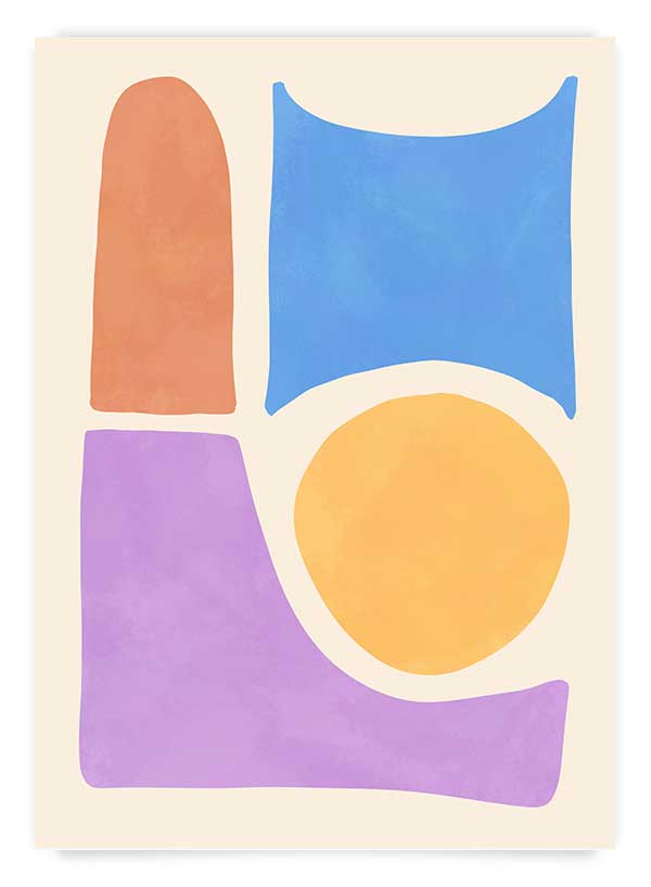 Un poster cu ilustrații geometrice în culori pastelate, potrivit pentru un spațiu cu atmosferă jovială sau chiar pentru camera copiilor.