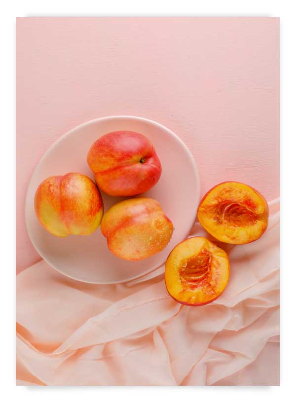 Fotografie cu piersici pe fundal roz pastel.