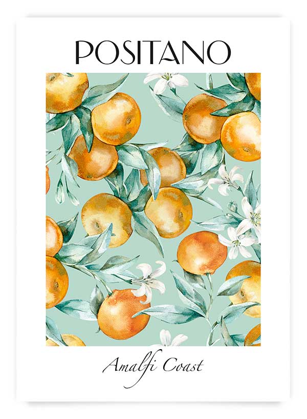 Poster vintage mediteranean cu crenguțe de lămâi pe fundal verde și text Positano - Amalfi Coast. Design-ul include marginea albă.