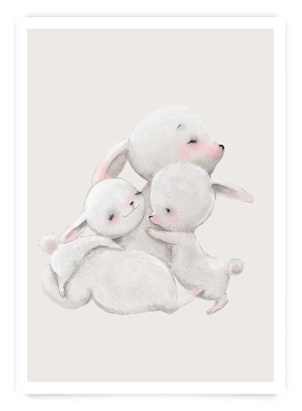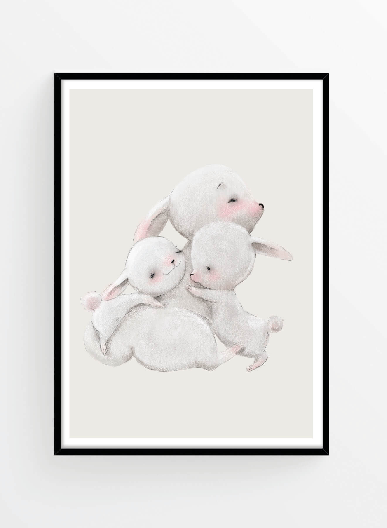 Ilustrație emoționantă cu o familie de iepurași pentru decorarea camerei copiilor.