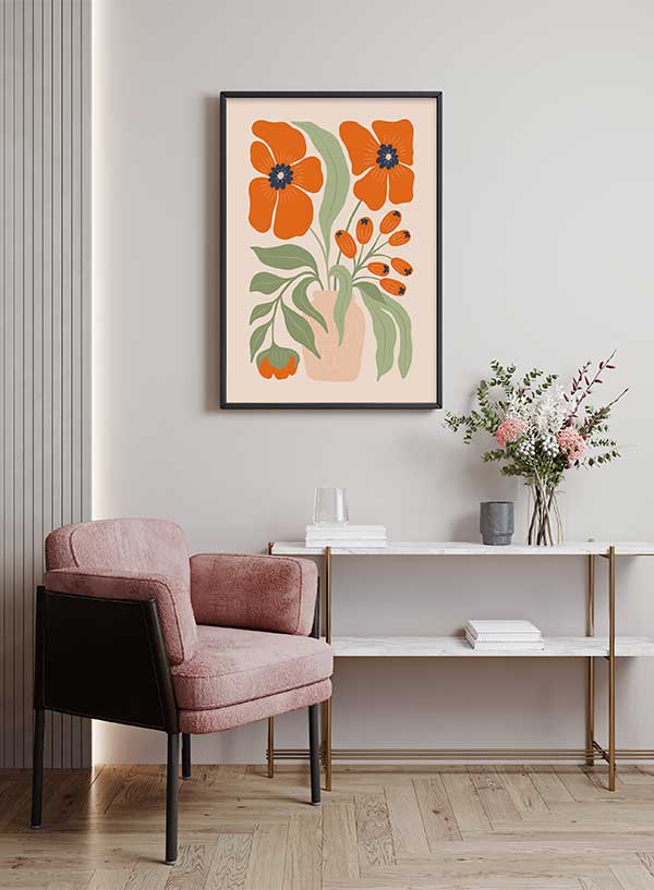 Ilustrație modernă cu flori în vază pe fundal bej.