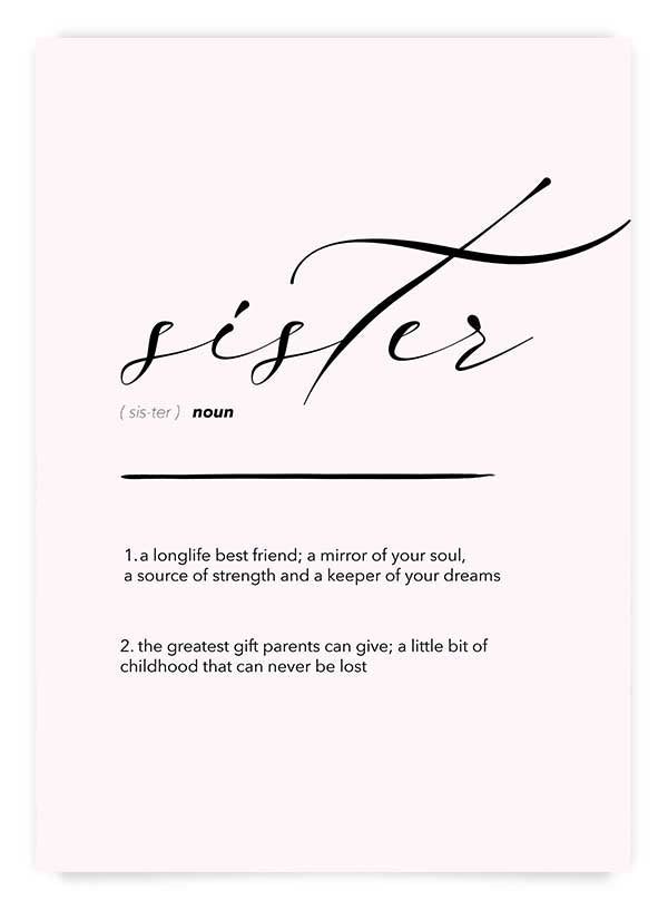'Sister - 1. a longlife best friend; a mirror of your soul, a source of strength and a keeper of your dreams. 2. the greatest gift parents can give; a little bit of childhood that can never be lost'