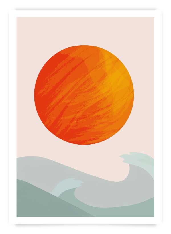O lucrare geometrică minimalistă cu soare și valuri pe fundal bej. Decorează camera unui iubitor de călătorii ca să-i amintească mereu de clipele minunate petrecute la mare.