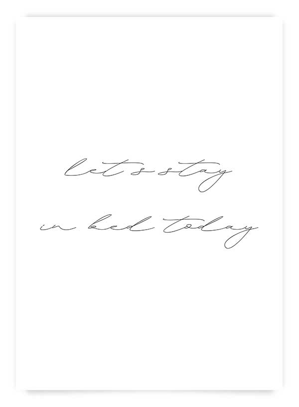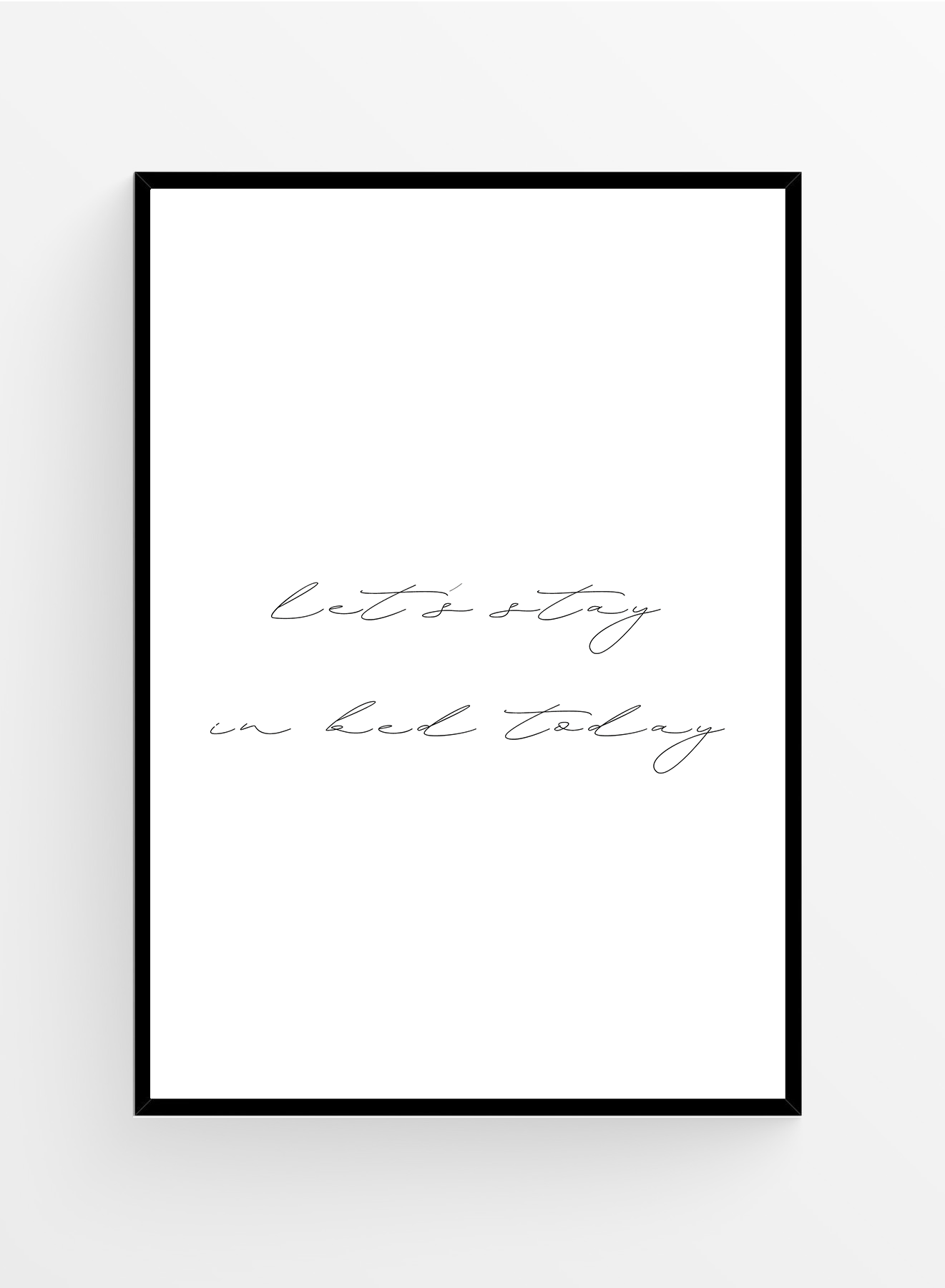 Poster cu citat pe fundal alb: 'Let's stay in bed today'. Îl poți agăța deasupra patului din dormitor alături de o ramă albă, neagră sau de lemn.