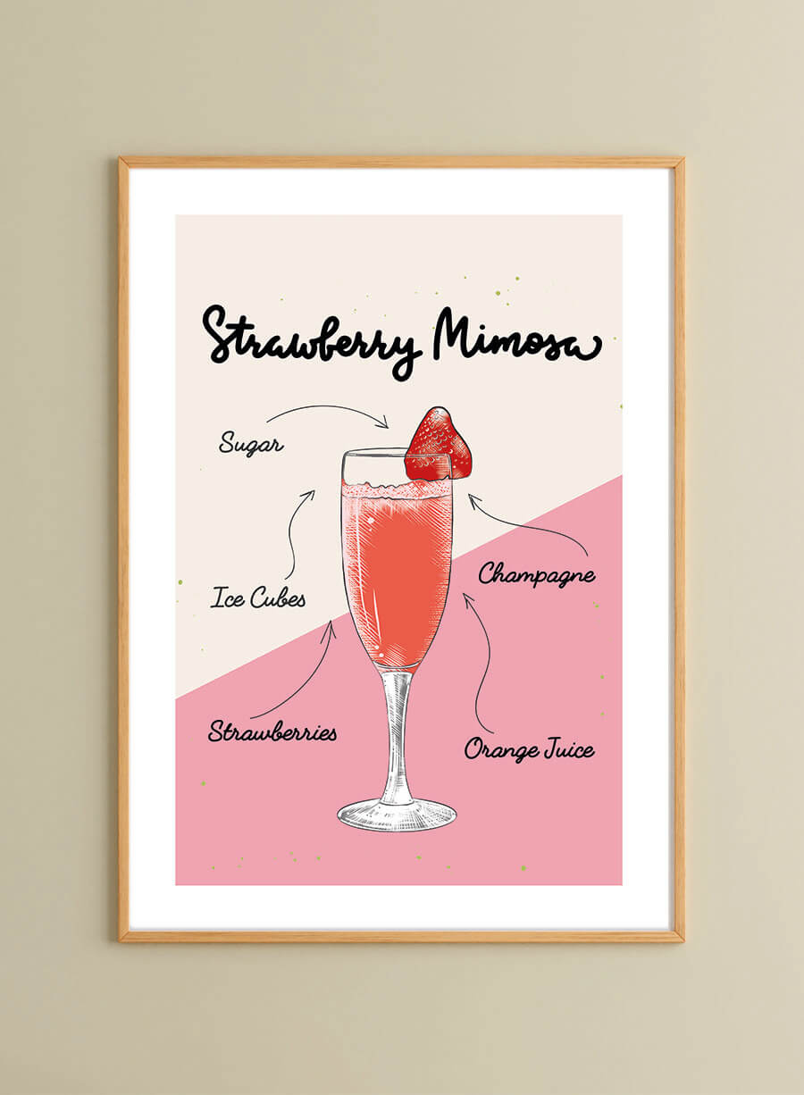 Poster ilustrație cocktail 'Strawberry Mimosa' care integrează rețeta într-un mod creativ. Perfect pentru decorarea bucătăriei, de oferit cadou sau pentru restaurante și pub-uri. Poate fi comandat împreună cu celelalte modele de postere cu rețete de cocktail-uri.