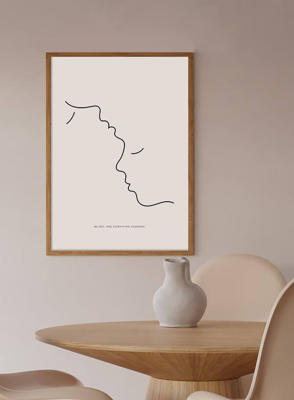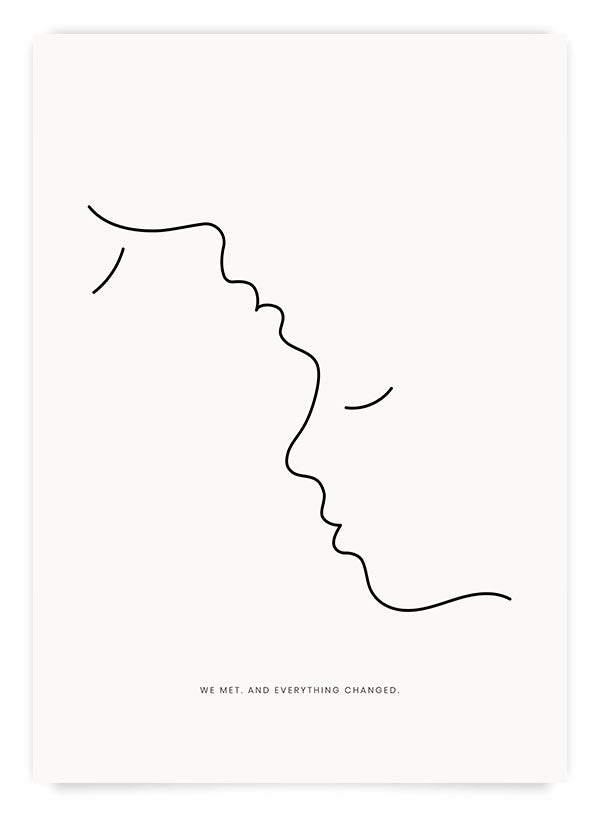 Postere cu ilustrație line art și text 'We met. And everything changed'.