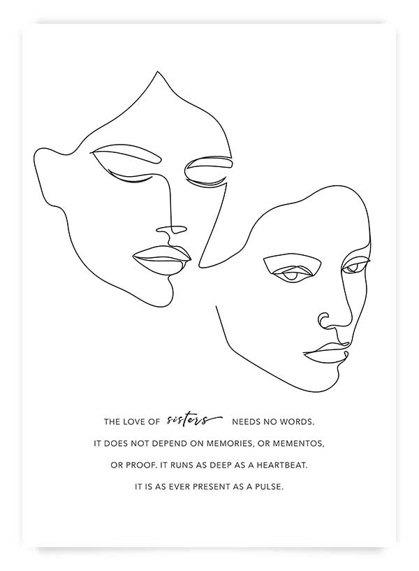 Poster line art care ilustrează două chipuri feminine pe fundal alb alături de un citat în engleză: 'The love of sisters needs no words. It does not depend on memories, or mementos, or proof. It runs as deep as a heartbeat. It is as ever present as a pulse.'