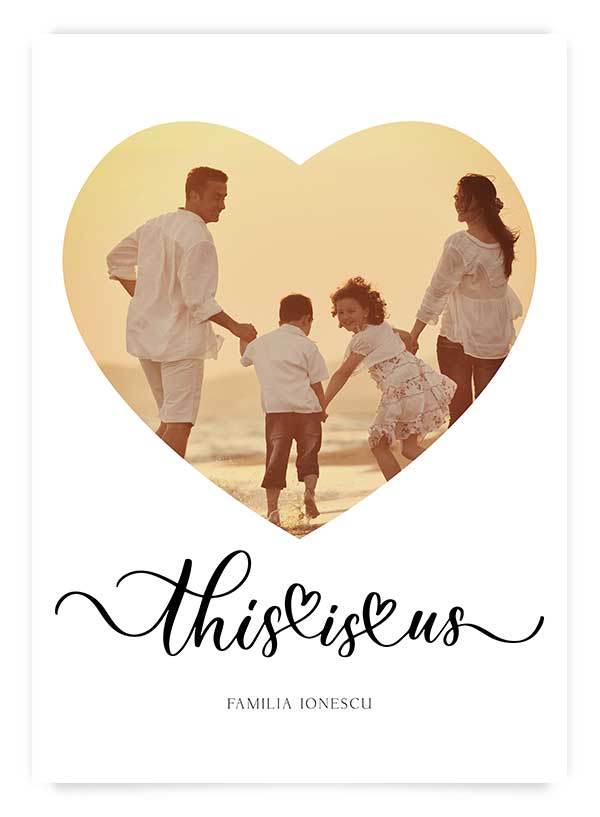 Alege un cadou unic, pentru totdeauna! Poster personalizat cu fotografia familiei și text elegant 'This is us' pe fundal alb. În partea de jos se personalizează cu numele de familie.