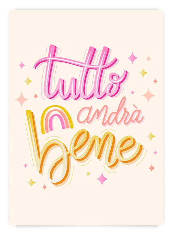 Poster tipografic cu text în italiană 'Tutto andra bene' (totul va fi bine) și ilustrații pe fundal crem. Dăruiește posterul persoanelor dragi sau expune-l într-o zonă a casei ca afirmație pozitivă, să-ți amintești în fiecare zi că totul va fi bine.