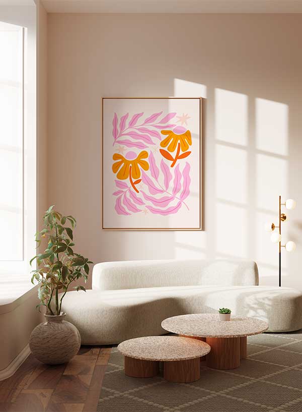 Poster cu ilutrații botanice în nuanțe de roz și portocaliu.