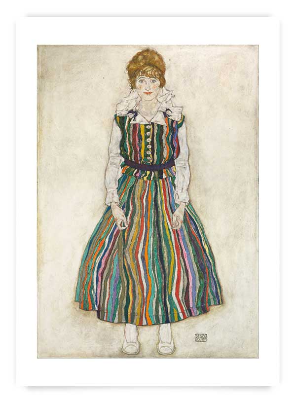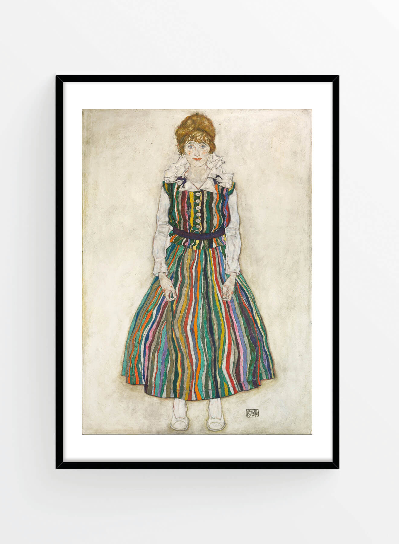 Portretul expresiv al soției artistului austriac Egon Schiele - 'Portrait of Edith Schiele, the artist's wife'. Cu un aer nostalgic, posterul de perete se va integra armonios în interioare clasice sau vintage. Ideal pentru iubitorii de artă, pentru întregirea galeriei de acasă.