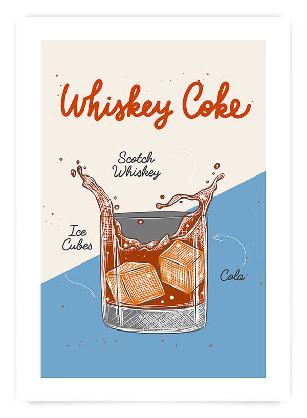 Poster ilustrație cocktail 'Whiskey coke' care integrează rețeta într-un mod creativ. Perfect pentru decorarea bucătăriei, de oferit cadou sau pentru restaurante și pub-uri. Poate fi comandat împreună cu celelalte modele de postere cu rețete de cocktail-uri.
