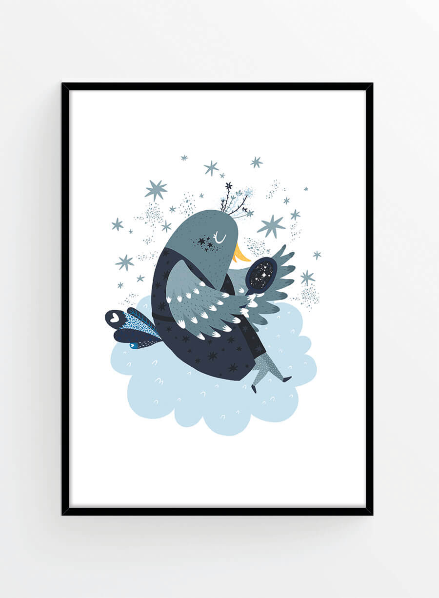Un poster cu ilustrație în nuanțe de albastru pentru camera copiilor.